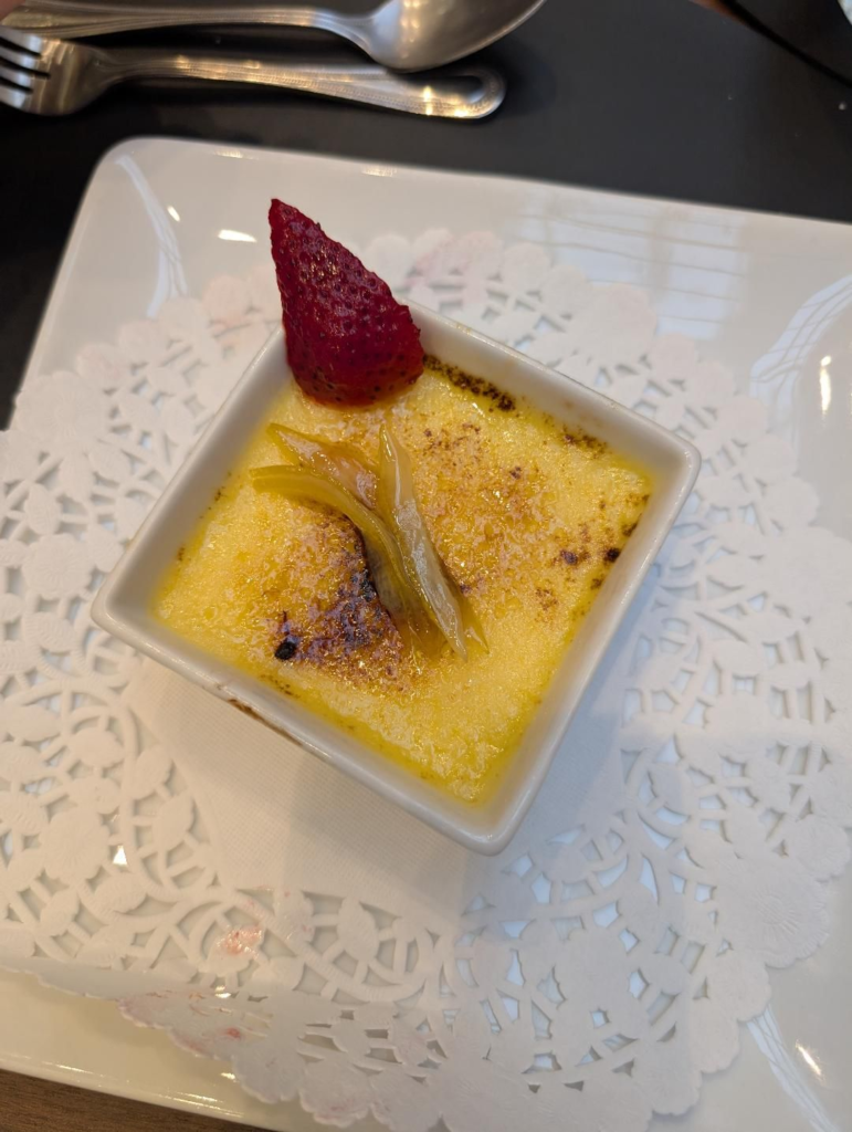 La crème brûlée au citron, dégustée par Christophe et Ecaterina, présentait « une coque parfaitement exécutée », mais Christophe regrette que « la crème manquait cruellement de tenue ». Ecaterina confirme : « la crème, servie tiède, était trop liquide et manquait de tenue ».