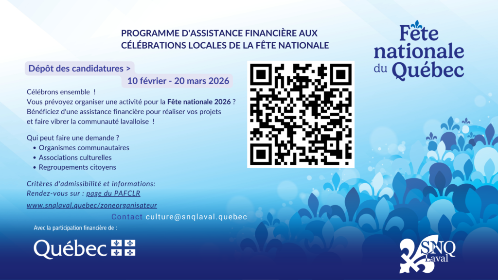 « Les communications autour de la Fête nationale 2026 s’entament et nous sommes ravis d’annoncer que le programme d’aide financière pour l’organisation de fêtes locales sur le territoire lavallois s’ouvrira le 10 février et que vous aurez jusqu’au 20 mars 2026 pour soumettre vos projets au jury de sélection. »