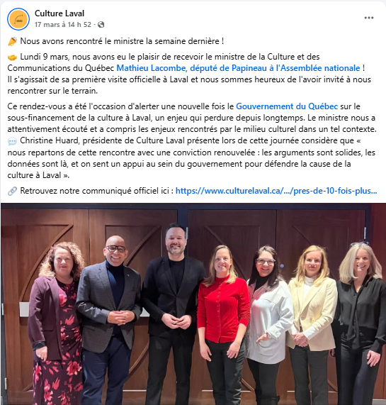 « Nous repartons de cette rencontre avec une conviction renouvelée : les arguments sont solides, les données sont là, et on sent un appui au sein du gouvernement pour défendre la cause de la culture à Laval », a déclaré Christine Huard, présidente de Culture Laval, dans cette publication.